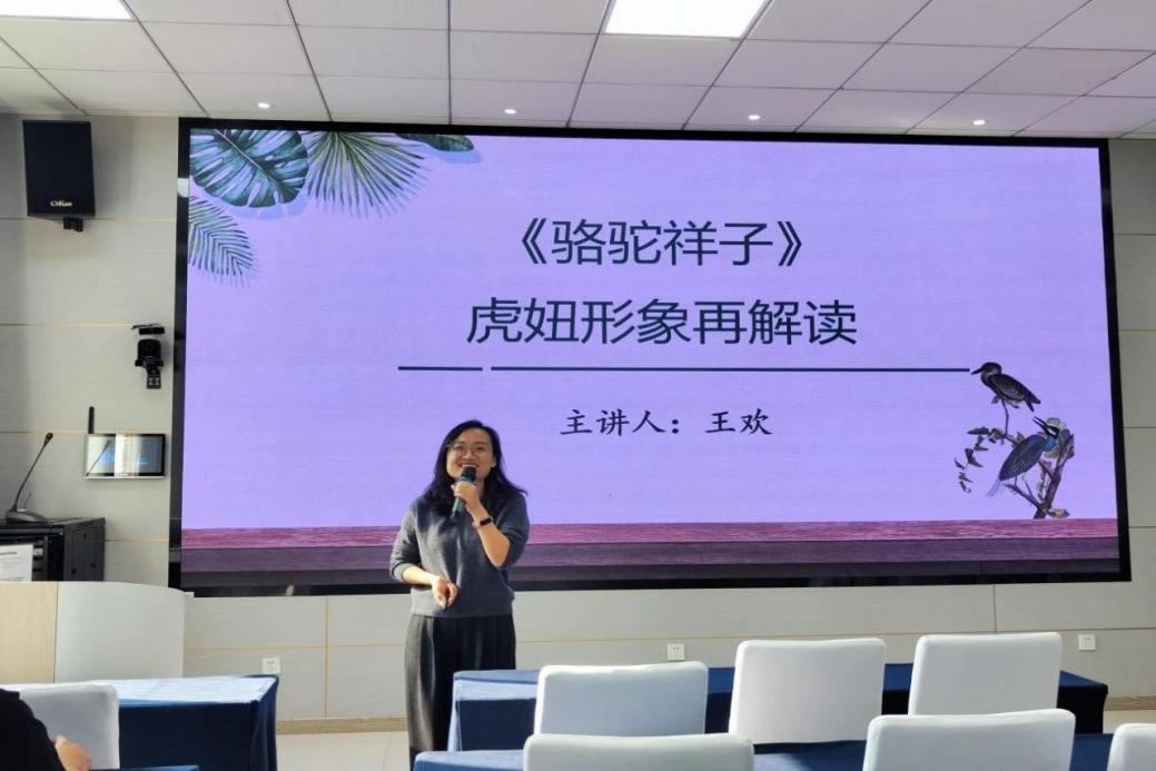 首先进行教学示范的是中国现当代文学教研室的王欢老师,她主讲内容是《虎妞形象再解读》。王欢首先借助《骆驼祥子》的小说、影视和不同时代的文学史这三重视角,总结了以往研究中虎妞被一味丑化和扭曲的形象特征。接着回归文本,以祥子和虎妞的复杂关系为中心,对虎妞进行客观、全面、深入地研究,梳理出虎妞对待事业、家庭、爱情三方面的具体细节,发现了虎妞多个侧面的真实形象。以此证明虎妞身上浓缩了现实社会的丰富信息,是一个真正来自民间社会的生动丰满的女性形象。最后,王欢分析了老舍小说中的男权主义思想,恰恰成就了虎妞“没有经过男性目光的过滤”,成为中国现代文学史上最具光彩的女性市民形象。