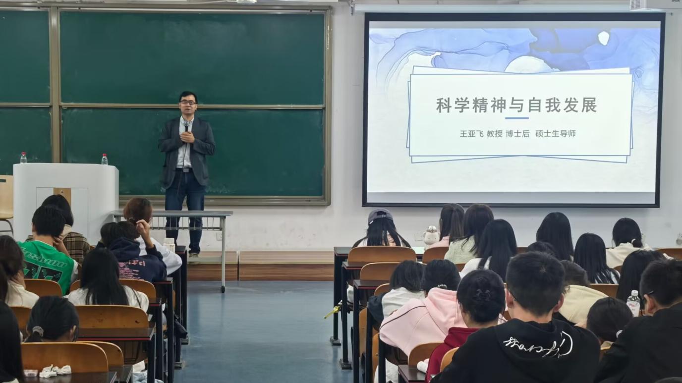 在科学道德建设逐渐成为学生成长学习不可或缺的一部分的背景下,王亚飞老师围绕“科学精神与自我发展”的主题展开,对社会内卷与学历贬值的现状进行剖析,进而指明了探索和创新精神的重要性,鼓励学生积极深造,提高学历。紧接着,王亚飞老师以学生自我发展需要的成就动机和内容两大板块,从专业知识、实践能力和科学的三观三个层面,结合生动的具体事例,不仅创造了一个轻松愉悦的学习环境,也加深了学生们对自己未来发展路径的理解与认知。