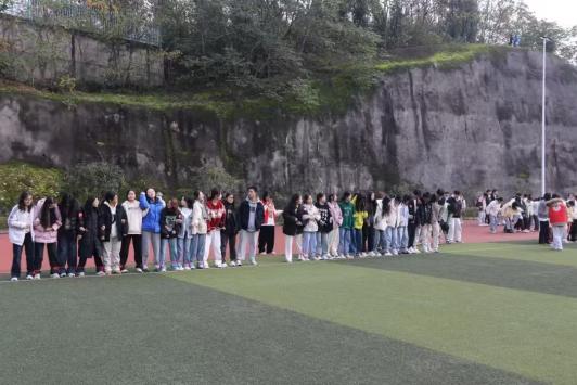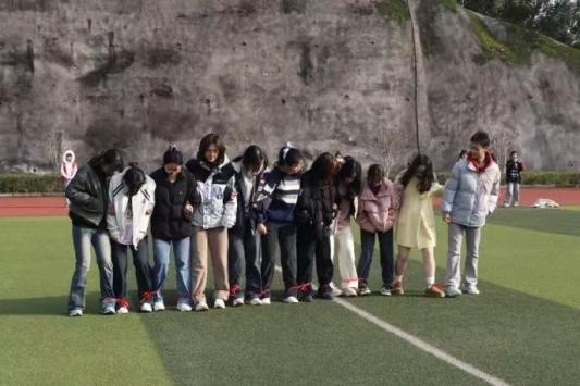 在三脚同盟比赛中,同组队友一人的左腿和另一人的右腿在脚踝附近用丝带捆绑联系,步伐一致向设定终点前进,按小组完成时间先后记分。在比赛开始前,每一个小组都积极地为这场团队协作的比赛出谋划策,并不断地尝试与练习。比赛正式开始,随着“一二,一二......”整齐有力的口号声的响起,同学们尽管在一开始脚步踉跄,也会迅速被同伴扶住,继续前行,充分展现团结协作的力量与友爱和谐的氛围。