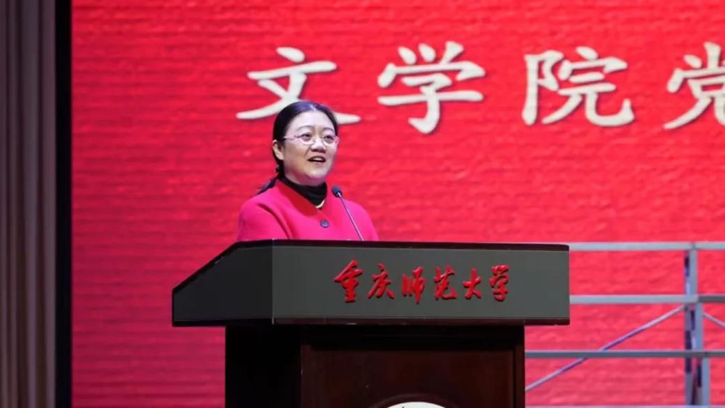 文学院党委书记税强致辞。她首先代表学院党政,向出席大会的全体老师和同学们以及各位嘉宾表示热烈欢迎;向将受表彰的各位老师和同学表示热烈祝贺。接着,税强书记介绍了学院近年来的发展和成就,指出文学院将继续深入落实立德树人根本任务,高度重视文化建设,秉持“惟精惟事,以文化人”的办院理念,推出“精是”学术文化品牌;推出以“璀璨文院、群星闪耀”为主题的榜样示范品牌,设置学院教师之星、学生之星,构建学院之星遴选认定体系,营造从个人“一枝独秀”到学院“群星闪耀”的文化氛围,共筑“各美其美、美美与共”的文化环境。