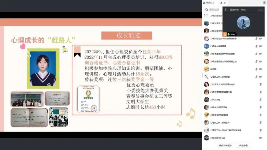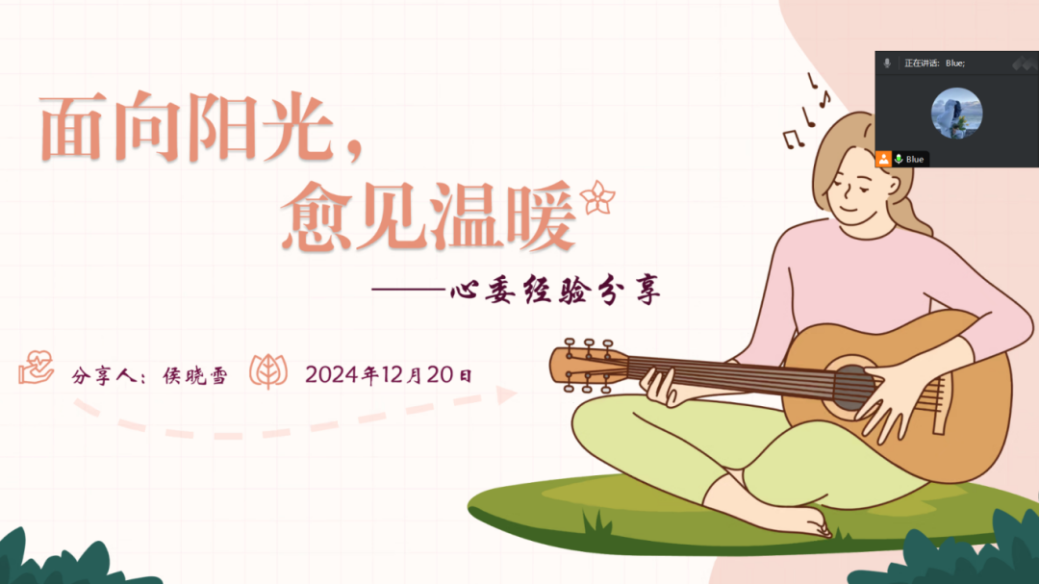 为进一步提升学院心理健康工作水平,提高心理委员履职能力与实践能力,为同学们的心理健康保驾护航,文学院于12月20日11时开展心理委员线上经验交流会。此次交流会特邀文学院2022级校级“十佳心理委员”侯晓雪同学主讲,文学院各班级心理委员聆听学习。