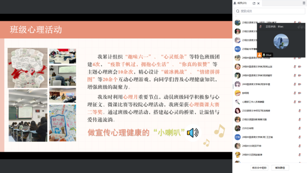 会议伊始,侯晓雪同学明确指出心理委员的职责定位,强调心理委员在班级心理健康建设方面的重要作用。接着,她从自身工作经验出发,展示了她作为心理委员组织的各类班级心理活动,通过开展特色团建活动、建设“倾听心理烦恼的‘小树洞’”、进行一对一心理谈话和心理问题反馈机制等方式,不仅有效地向同学们宣传了心理健康知识,做到动态监测班级心理健康状况,确保及时发现和有效处理心理问题,也增强了班级凝聚力。