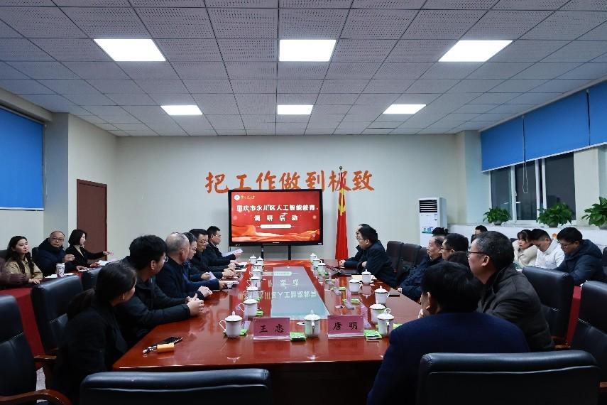 永川区教委副主任陈启寨和相关职能部门领导全程参与调研,陈主任表示,此次调研揭开了区域AI教育改革的序幕:“我们将设立一批实验学校,在2025年秋季学期率先试行‘双师课堂’模式,由高校远程协助课堂教学,同时启动教师AI素养全员测评。”