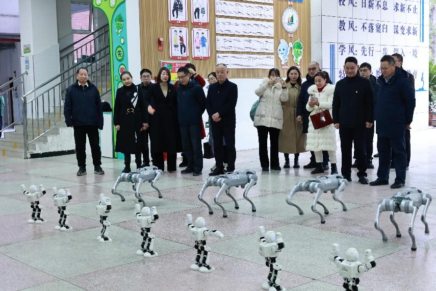 调研活动分别在两所学校的校园文化展示区、现代化体育馆、元宇宙感知实验室、航模室、激光切割室与3D打印、科技感女娲梦创空间等地有序展开沿途,学生精彩的机器狗互动、无人机表演、机器人跳舞等,彰显了学校完善的数智教育硬件和精心打造的创客特色教育环境。