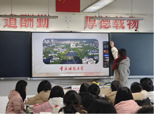 1月20日,2024级中国语言文学类专业6班的牟美银走进重庆市万州新田中学,开展了一场以“我为学校代言,续写光荣篇章”为主题的宣讲活动。她从学校的教学优势、校园生活环境以及毕业生就业情况三个方面进行了详细的介绍,并准备了学校的宣传册和海报供大家传阅,让学弟学妹对重师有了更深入的了解。