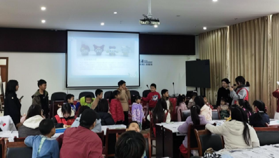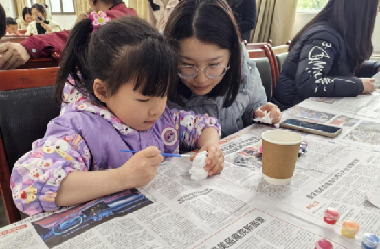 游戏环节结束,迎来孩子们最期待的石膏娃娃彩绘环节。志愿者们为小朋友分发颜料、画笔和石膏娃娃,耐心指导他们调色、上色。小朋友们充分发挥想象力,为手中的石膏娃娃披上五彩斑斓的 “外衣”,现场一片专注创作的温馨景象。