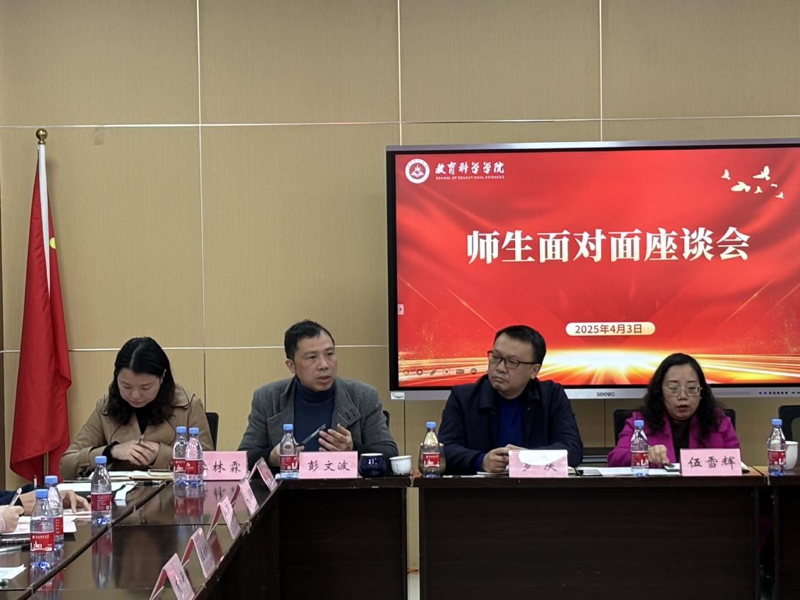 为深入贯彻落实“以生为本”的教育理念,进一步畅通师生交流渠道,切实解决学生的各类学习问题,促进学生全面发展,教育科学学院于2025年4月3日下午,在砺志楼2421会议室举办了师生“面对面”座谈会。本次座谈会由学院副院长彭文波主持,党委书记罗庆,院长朱桂琴,党委副书记、纪委书记李林霖,副院长魏勇刚,院长助理伍雪辉,各专业主任熊韦锐、谷小燕、高晓慧,学前教育系教授邵小佩,党政办公室主任肖颖,团委书记、学工办主任杨逐、教学秘书曹琴以及各级研究生和本科生学生代表参与了此次座谈会。