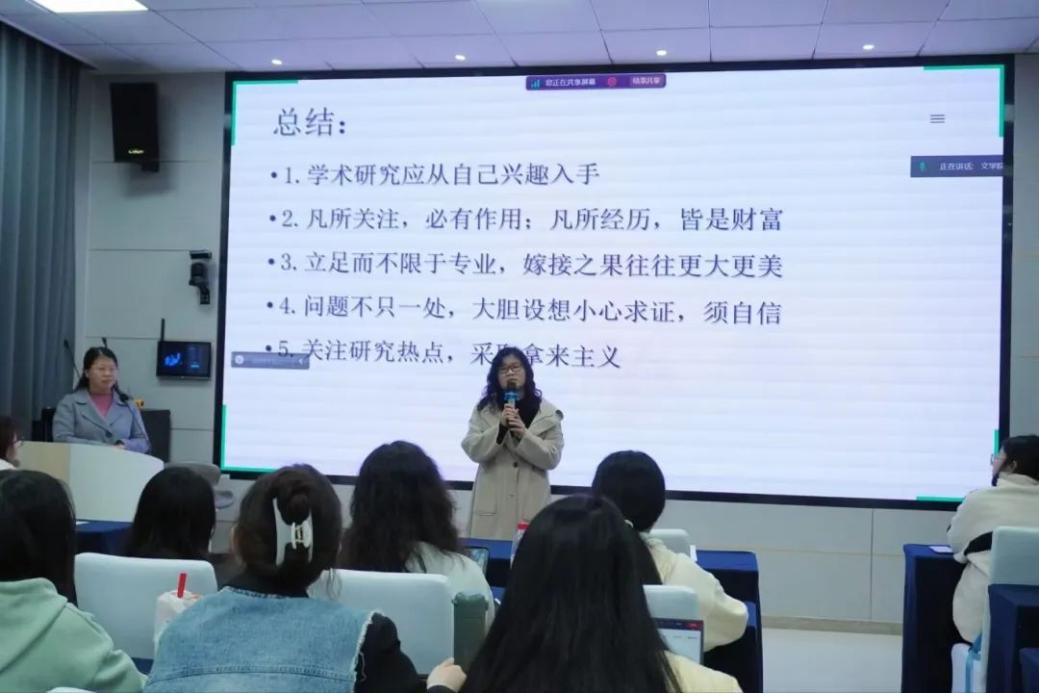 针对青年学子的研究困惑,杨教授强调学术视野的辩证统一。她表示自己发过的论文主题看似乱杂,但实际上有着内在逻辑,始终围绕文学展开,衍生出 “文学 + 民间信仰”“文学 + 地理学”等研究方向。杨教授鼓励同学们在学术探索过程中,既要拓宽视野,广泛涉猎不同领域知识,又要在某一专业方向深耕细作,做到专精。