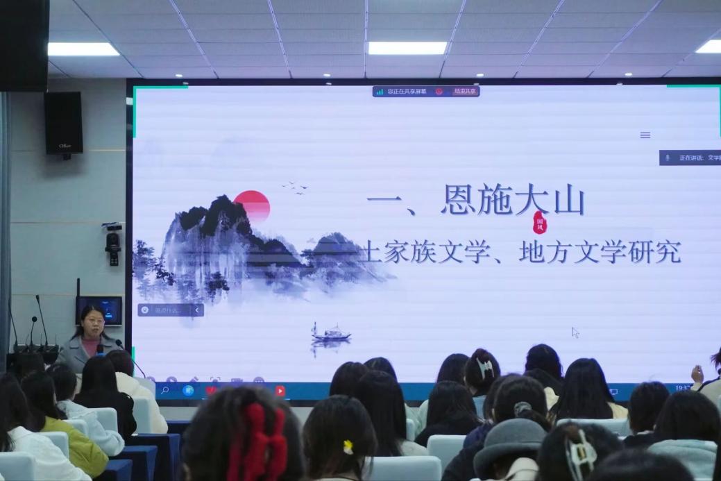 讲座伊始,杨宗红教授凭借丰富的经历,深入浅出地阐释了学术与日常生活的深刻联系。从童年亲历的"哭嫁""哭丧"民俗,到《论土家族哭嫁歌的孝道内涵》等系列论文的产出;由家族姓氏触发的《田氏一家言》研究,延伸出《论容美田氏土司诗人群对唐诗的接受》等民族文学研究成果;将少年时期民间信仰记忆升华为博士论文选题,最终完成《财神"五通"论》及教育部课题。值得一提的是,杨教授将十年中学地理教学经历与文学研究的创造性结合,推动她成功申报文学地理学领域的国家课题,并发表一系列相关论文。杨教授以这些亲身经历使同学们深刻认识到,学术研究并非遥不可及,兴趣和日常生活就是学术探索的重要起点。