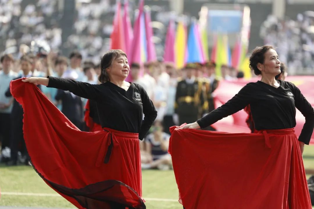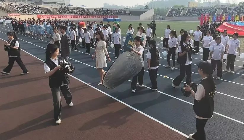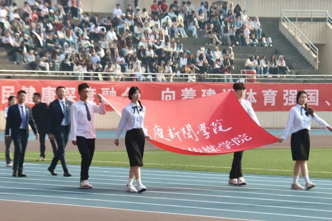 开幕式上,新闻与传媒学院师生身着学院院服,步履铿锵。新传学子带来精彩表演,他们化身为时代浪潮中的追光者,展现“内容+科技+传播”融合创新的学院特色。在这个瞬息万变的世界里,新传学子以笔为剑、以镜头为眸,用速度追逐热点,以创意点亮屏幕,将赛场化作舞台,用创意和活力诠释新时代传媒人的昂扬姿态!