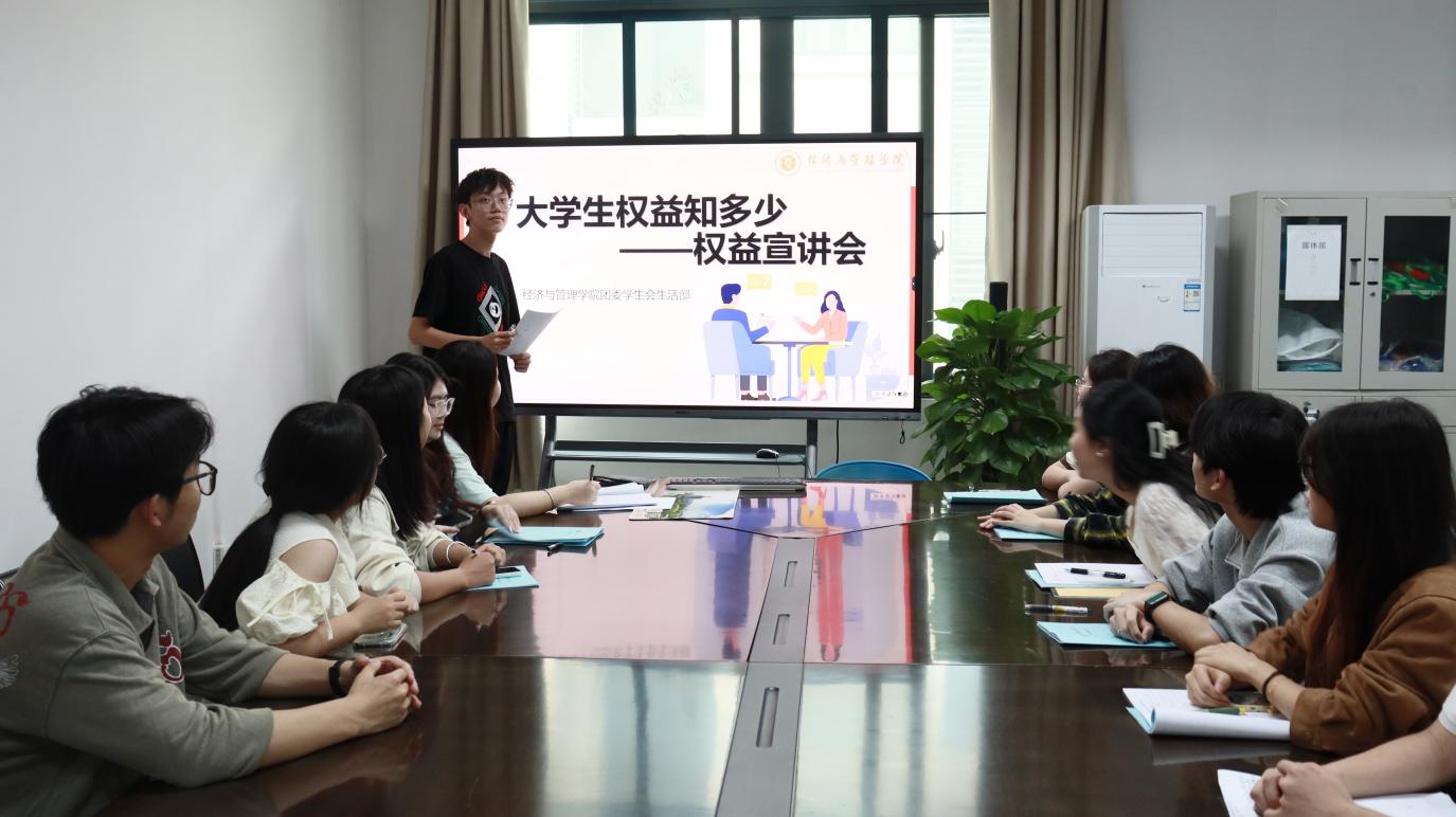 为增强大学生权益保护意识,提升学生自我维权能力,56中午,经济与管理学院团委学生会于求是楼316开展“大学生权益知多少”权益维护宣讲会。本次宣讲会由团委学生会生活部负责人葛欣恺主讲,第十九届团委学生会全体成员参与。
