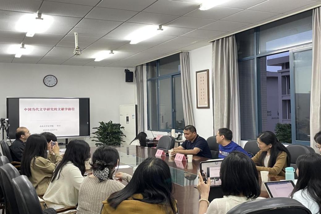 2025年4月27日晚,文学院“精是讲堂”第132期在汇贤楼406举行。本期讲座特邀山东大学教授、博士生导师宫立教授主讲《中国当代文学研究的文献学路径》,范国富教授主持,杨华丽、杨姿、王欢等教师一起出席,中国现当代文学专业硕士研究生、重庆市抗战文史研究基地支部党员同志有幸到场聆听。