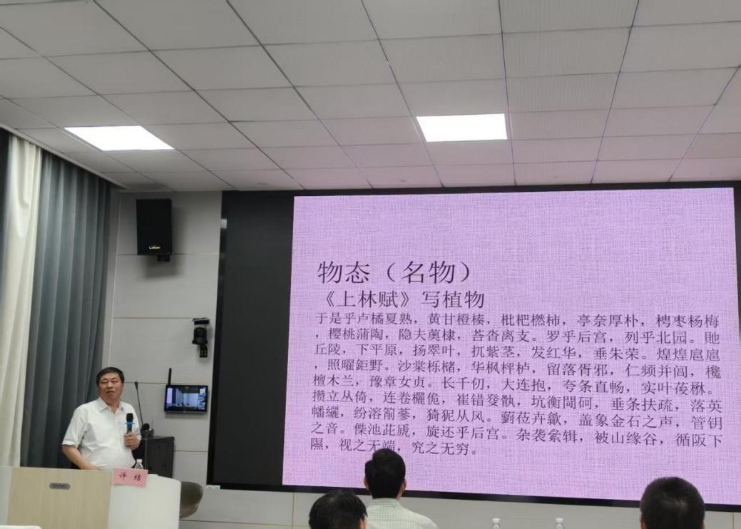 然后,许结教授谈到了赋圣司马相如的用字。他弹琴而感文君,赋诵而惊汉主。汉赋形成的三大制度包括京都、职官和礼乐。从京都而言,汉赋是最早一代宫廷文学的体现。司马相如作为内官,在一个问题提出来的时候,往往是内官与外官相辩。在天子礼仪方面,礼仪若想要大量表现,就与汉赋有关,因此,汉赋的文字就变得越来越多。在此基础上,许结教授为大家展示了《上林赋》中的名物、水态等,展现汉赋词章之美。