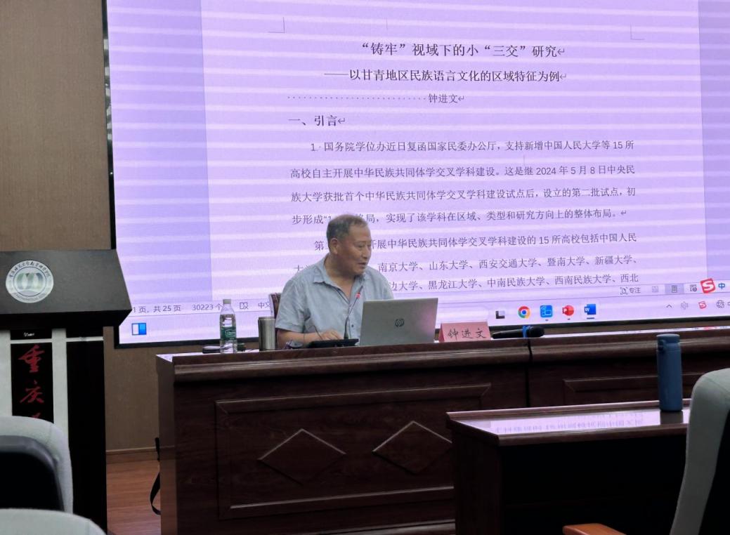 2025522下午,“精是讲堂”第136期在汇贤楼122报告厅举行。本期讲座以《“铸牢”视域下的小“三交”研究—以甘青地区民族语言文化的区域特征为例》为题,特邀中央民族大学特聘教授,博士生导师钟进文主讲,由文学院何易展教授主持。