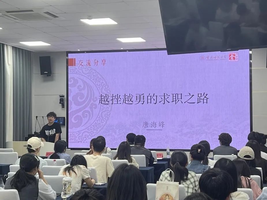 活动伊始,现就职于重庆市高新区人民医院党政办的唐海峰校友率先分享。他以自身从外卖配送、校园办卡员等各类兼职起步,到进入中石化实习,最终成功入职医院党政办的求职历程为切入点,坦诚讲述了考公考研失利、求职碰壁的挫折经历,勇于尝试成了他奋斗的底色。他坦言,自己是个平凡人,职业生涯并非一帆风顺,唯有通过不断地创新、学习与创造,才能冲破桎梏、打破偏见,铸就属于自己的不平凡。唐海峰强调,公文写作、职业礼仪等专业核心技能是职场立身之本,建议同学们在校期间不仅要夯实专业基础,更要通过丰富的社会实践积累经验,增强简历竞争力。而在成长的道路上,他感慨道:“迷茫是自由的眩晕感”,鼓励学弟学妹们要以接纳、包容、自信的心态,走出独属于自己的精彩道路。