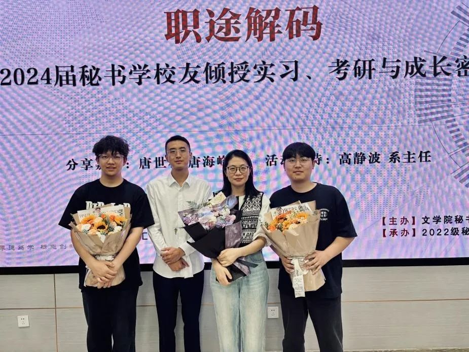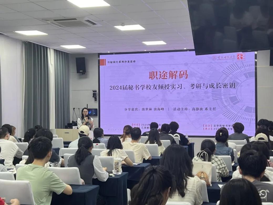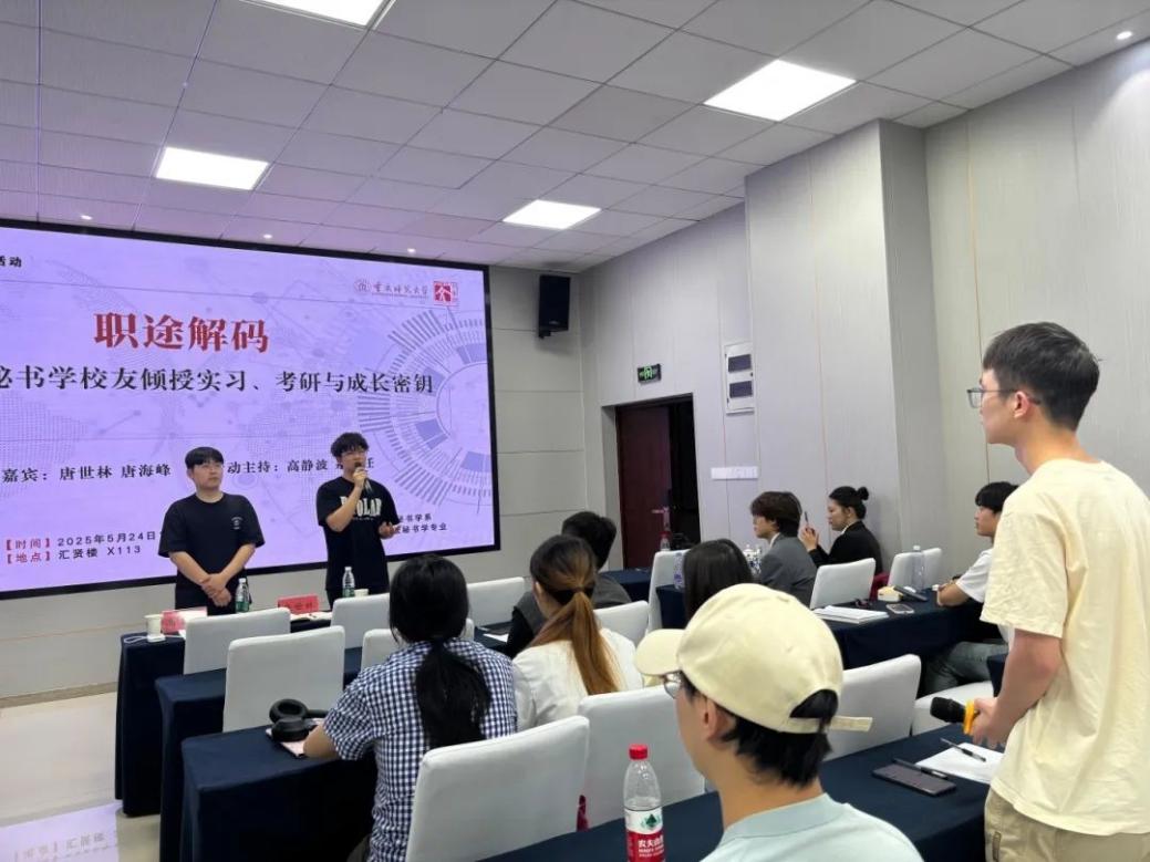 2025年5月24日晚,我校文学院秘书学专业首场与秘同行赋能专业成长系列沙龙活动在汇贤楼113会议室举行。本期分享会以“职途解码:秘书学校友倾受实习、考研与成长密钥”为主题,特邀2024届毕业生唐海峰与唐世林两位优秀校友代表返校分享个人成长经验。秘书学系主任高静波主持,秘书学2023级辅导员顾纹豪出席,2022级和2023级秘书学专业同学踊跃参与,师生们齐聚一堂,互相汲取成长智慧,共话秘书学专业的持续发展之道。