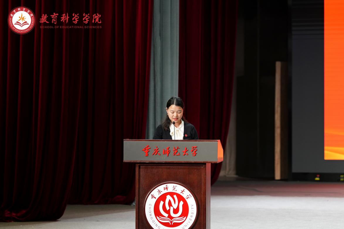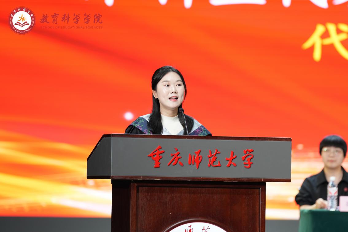 代雨芯同学提到,毕业生们牢记习近平总书记的嘱托,积极响应号召。去到西部、祖国最需要的地方;有的走进基层,为人民群众排忧解难;有的站上三尺讲台,用所学助力学生健康成长;还有的在科研道路上探索,为学科发展贡献力量。她希望同学们以厚德之心待人,以笃学之心求知,以励志之勇前行,以创新之思突破,牢记重师校训精神,奋勇追逐梦想。
