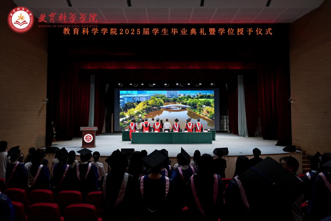 6月17日下午,M88教育科学学院2025届学生毕业典礼暨学位授予仪式在校友会堂隆重举行。教育科学学院学位评定委员会委员、学院党政领导、各系支部书记、系主任、学院科级干部、教师代表、2025届毕业生和家长代表参加此次毕业典礼。教育科学学院院长助理伍雪辉主持典礼。