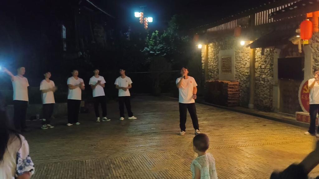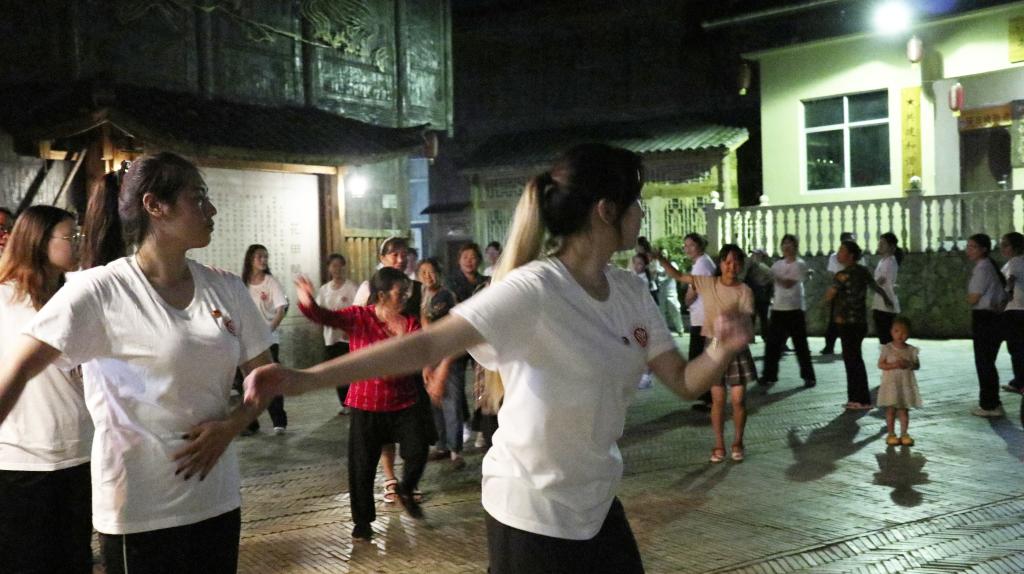 酉阳县地处武陵山区,何家岩村作为土家族重要聚居地之一,保留着丰富的民族文化资源。摆手舞是土家族最主要的标志性文化形态,2008年,摆手舞被列入首批国家级非物质文化遗产名录,是土家人祭祀神灵、酬报先祖和传承民族文化的重要形式。傍晚时分,志愿者们在村干部的带领下,走进村里的文化广场,与村民们围在一起,伴随着音乐,共同跳起摆手舞。村民们还唱起当地特色山歌,欢迎团队成员。带队负责人怀着对家乡的深厚情感,登台演唱了歌曲《落叶归根》。歌唱结束后,他表示,他是酉阳的孩子,希望能用所学回报家乡,让家乡发展更好。随后,重师师生与村民们手牵手,再次跳起摆手舞,大家围成圆圈,欢快舞动,现场洋溢着欢乐氛围。