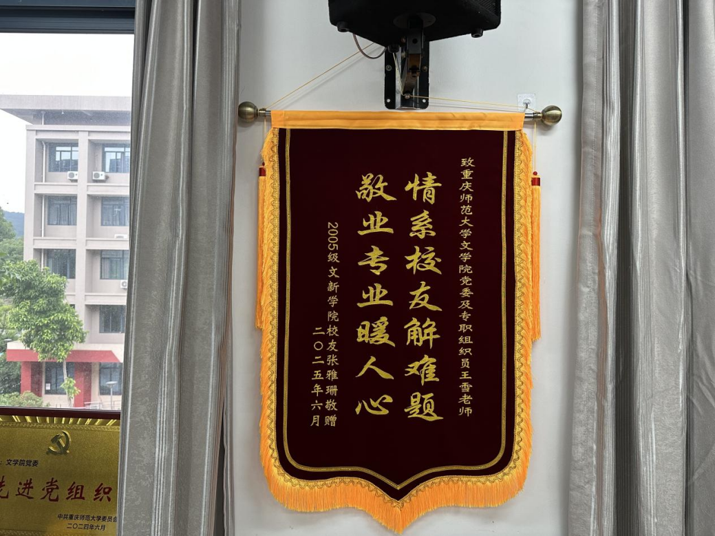 2025年6月,2005级文新学院校友张雅珊向M88文学院党委及专职组织员王雪老师赠送一面锦旗。锦旗上“情系校友解难题,敬业专业暖人心”的金色大字,不仅是毕业生对学院党委和专职组织员帮助其解决毕业生党员档案问题的感谢,更是学院党委和党务工作者的责任担当和暖心服务的生动体现。
