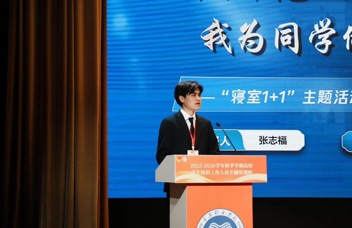 10月31日至11月1日,我校学生会执行主席张志福参加2025—2026学年秋季学期重庆高校学生组织工作人员专题培训班,并作为学员代表在“我为同学做事实”项目交流分享环节进行发言。其中围绕学校“寝室1+1”主题活动的美育实践探索,聚焦学生交流壁垒、线下互动不足等痛点,从打造普惠性美育载体、深耕核心竞赛板块、创新专项活动板块三方面进行阐述我校学生会的经验与成果,展现了校学生会在服务同学、推动美育实践方面的积极探索与扎实成效。