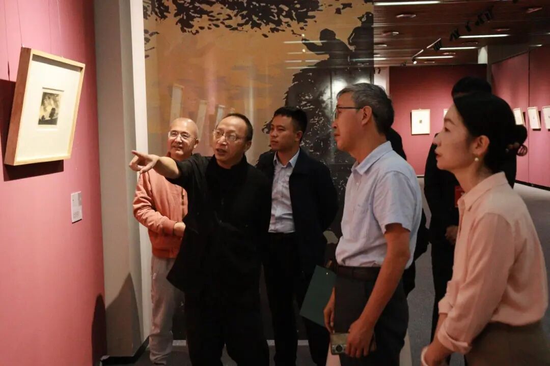 在学院“青马驿站”两名学生解说员的导览下,温容、杨长万两位校友细致观看了展览的每一件作品,不时驻足交流,分享对作品的感悟。面对丰中铁、王琦、李少言、牛文四位已故老艺术家的木刻版画作品,温容深有感触地表示:"这些诞生于烽火岁月的艺术作品,不仅具有极高的艺术价值,更承载着厚重的历史记忆,展现了文艺工作者在民族存亡关头的社会担当。