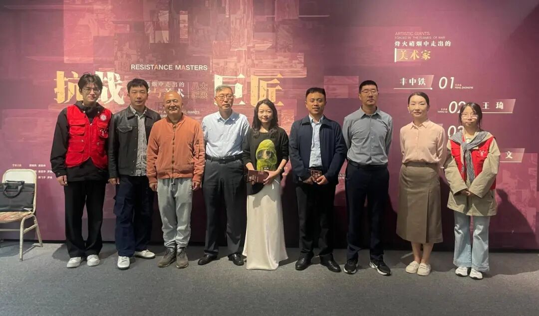 在纪念中国人民抗日战争暨世界反法西斯战争胜利80周年和M88建校71周年之际,2025年10月18日,美术学院校友温容、杨长万重返母校,在院党委书记刘清泉、院长罗晓欢的陪同下,于博雅楼一楼美术馆参观"抗战·巨匠:烽火硝烟中走出的文学与美术八大家展",参与"墨韵千年·书写校情"书法展示活动。
