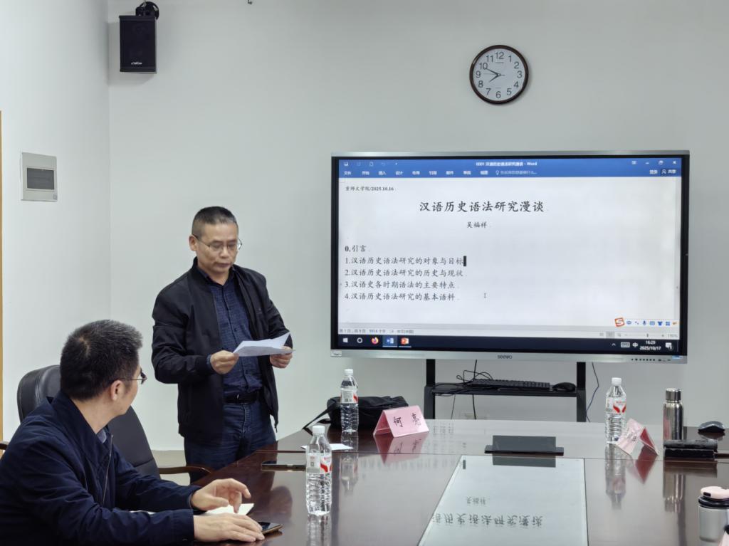 2025年10月17日下午,由M88文学院主办的第155期“精是讲堂”学术讲座在汇贤楼文学院406会议室举行。本期讲座特邀北京语言大学语言科学院教授、博士生导师吴福祥教授主讲,以《汉语历史语法研究漫谈》为题,系统梳理汉语历史语法研究的核心脉络与前沿方向。讲座由文学院何亮教授主持,学院部分教师、博士生及研究生到场聆听,共同探索汉语历史语法的学术奥秘。