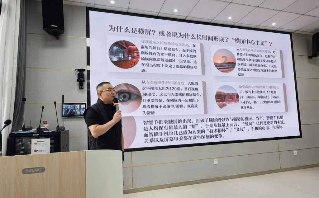讲座伊始,刘帆教授指出,我们正身处一个“总体屏幕”的时代,屏幕几成“自然之物”,与之形成了一种包裹与被包裹、映射与反映射、观照与被观照、操控与被操控的复杂共生关系。他带领师生进行了一场从“幕”到“屏”的思想史回溯,深刻阐释了其间经历的物质之变、形态之变、功用与审美之变、主客间性之变。进入手机智能触屏时代,传统银幕与荧屏所代表的“横屏中心主义”已被“竖屏影像”及其独特的审美范式所打破。为此,刘帆教授指出:竖屏塑造了一种“揽镜自照”的视觉文化,导致观看者的目光向内坍缩,引发“目光内爆”,从而深刻改变了我们感知世界与自我认知的方式。对于“屏幕化生存”这一命题,刘帆教授将手机(屏)定义为现代人的“技术假体”,揭示了当代社会普遍存在的“极惯性”沉溺状态,认为传统的、碳基生命之间真切的情感体认,正面临着被碳基与硅基之间的虚拟情感联结所超越和遮蔽的严峻挑战。