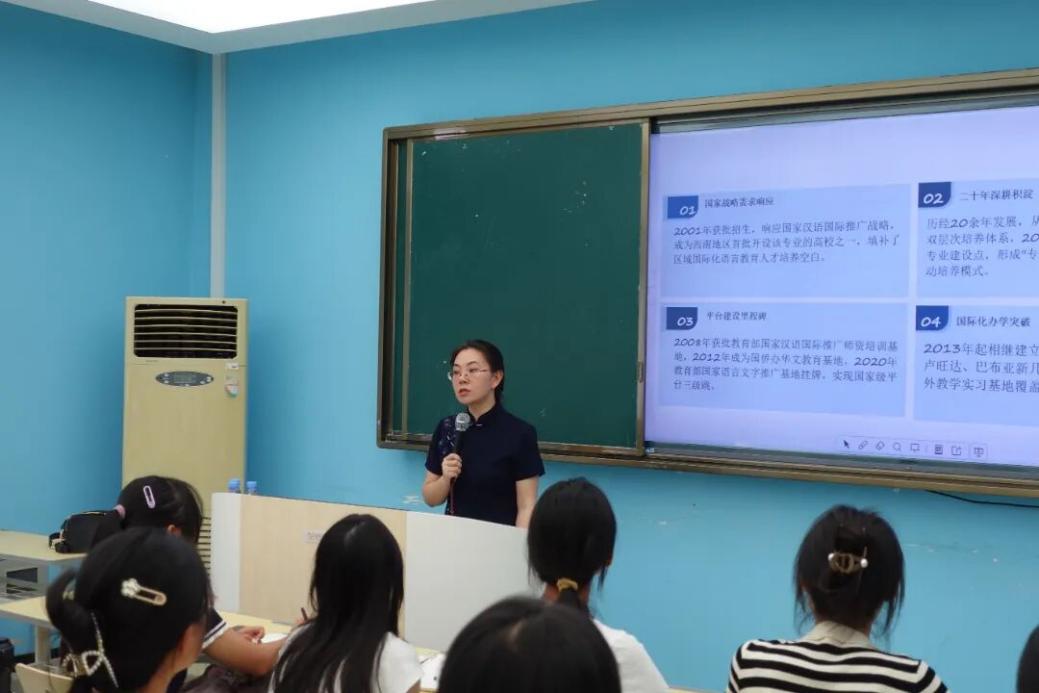 为扎实推进文学院专业思想教育走深走实,深化2025级新生对本专业的认识,全面了解本专业发展现状及其发展前景,激励学生锐意进取,文学院开展了2025级新生专业思想讲座,汉语国际教育教研室主任范桂娟、戏剧影视文学系主任娄吉海、秘书学系主任高静波、汉语言文学系主任唐旭作为本次专业思想教育讲座的主讲人,为新生们讲解文学院专业详情。