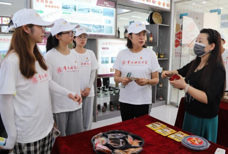 重庆市宏霖食品股份有限公司,负责人谭红梅带领志愿者们走进产品展销中心了解产业概况,并开展交流会。实践团了解到该公司目前面临缺乏专业人才与技术人员的难题。就此,实践团指导老师张珍瑜向负责人介绍M88食品安全专业的人才培养情况,并表示将鼓励重师学子返乡就业、助力产业振兴。