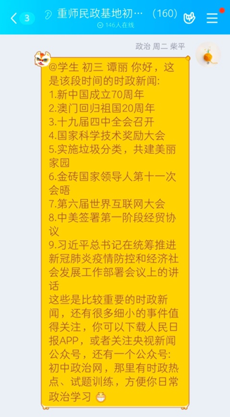 大年三十夜里,医护人员纷纷前往武汉支援的视频让我深受感动。在这场疫情防控阻击战中,我看见无数医护人员、公安战士、社区人员在全力保护人民的安全,很心疼他们。一看见肖陆军老师发的爱心家教志愿者招募公告,我就报名参加了,想要为白衣天使做点什么,即使微不足道,也想做一点实事。我在答疑辅导过程中,有时会遇到学生询问时政热点与中考知识点紧密结合的问题,由于对初中高频考点的不熟悉,刚开始解答会很慢。我会去看初中政治电子课本,还有微信公众号上的复习课件、时政特刊,同学生一起学习,共同成长。