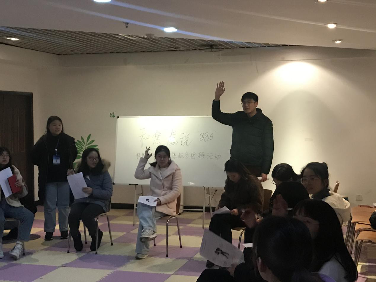 为缓解同学们的考前焦虑,帮助同学们克服学习生活中的困难,树立积极健康的学习生活态度,以最好的心态迎接期末考试。校团委党支部于12月16日中午13:00-14:00在校友会堂一楼心理辅导室开展了“和考前焦虑说886”的服务活动。此次活动由校团委副书记邸少华老师主讲。活动以团体辅导的形式开展,生动形象地让同学们认识到自己焦虑的原因并学习到相应的解决措施。通过这次活动,同学们都获益匪浅。