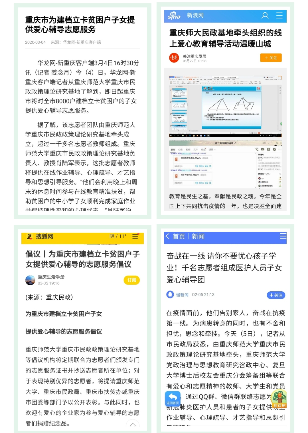 在此次项目中重师青年充分利用网络媒介,优化我校师生教育资源,面向全社会搭建网络教育服务平台,运用专业的师范生技能知识,制定个性化、专业化的辅导方案,为助力疫情防控,助力脱贫攻坚贡献自身青春力量。希望重师学子持续在各项志愿中书写绚丽画卷,在实践中彰显朝气蓬勃,不断提高自身素质,争做时代新人,勇担青年之责!